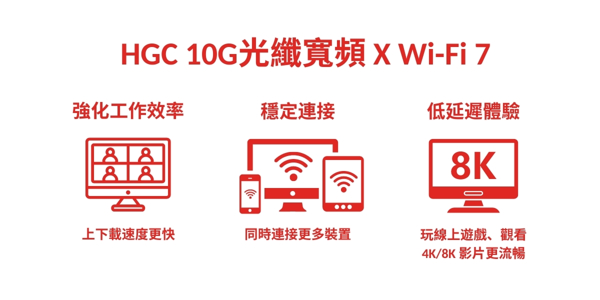 HGC 聯乘全球著名路由器廠商 TP-Link,為客戶提供 Wi-Fi 7 路由器服務。強大的 10G光纖寬頻,配合最新的 Wi-Fi 7 路由器,將無線網絡服務體驗推至另一高峰。 Wi-Fi 7 延續 Wi-Fi 6E 的優勢,以高達 320MHz 的頻寬,提供無縫的極速無線網路。