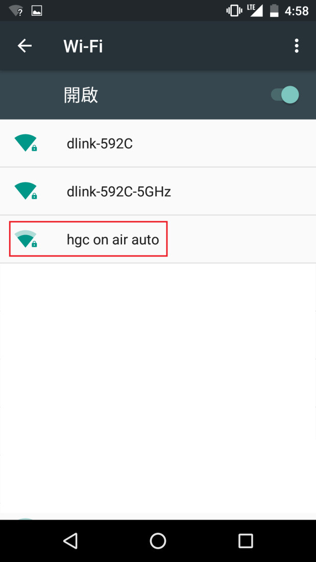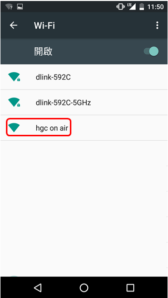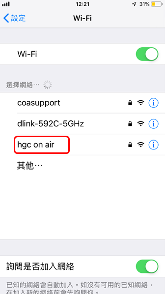 1. 搜尋附近的 Wi-Fi 網絡,選擇“hgc on air”。