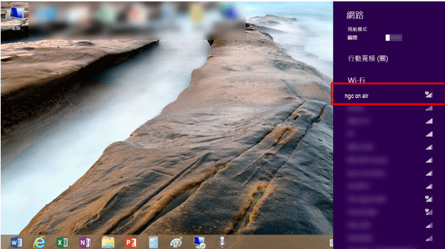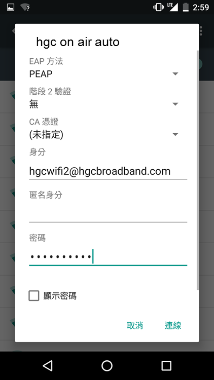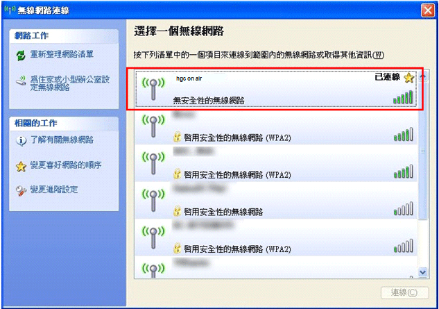1. 搜尋附近的 Wi-Fi 網絡,選擇“hgc on air ”,再按“連線”,系統將顯示“已連線"。