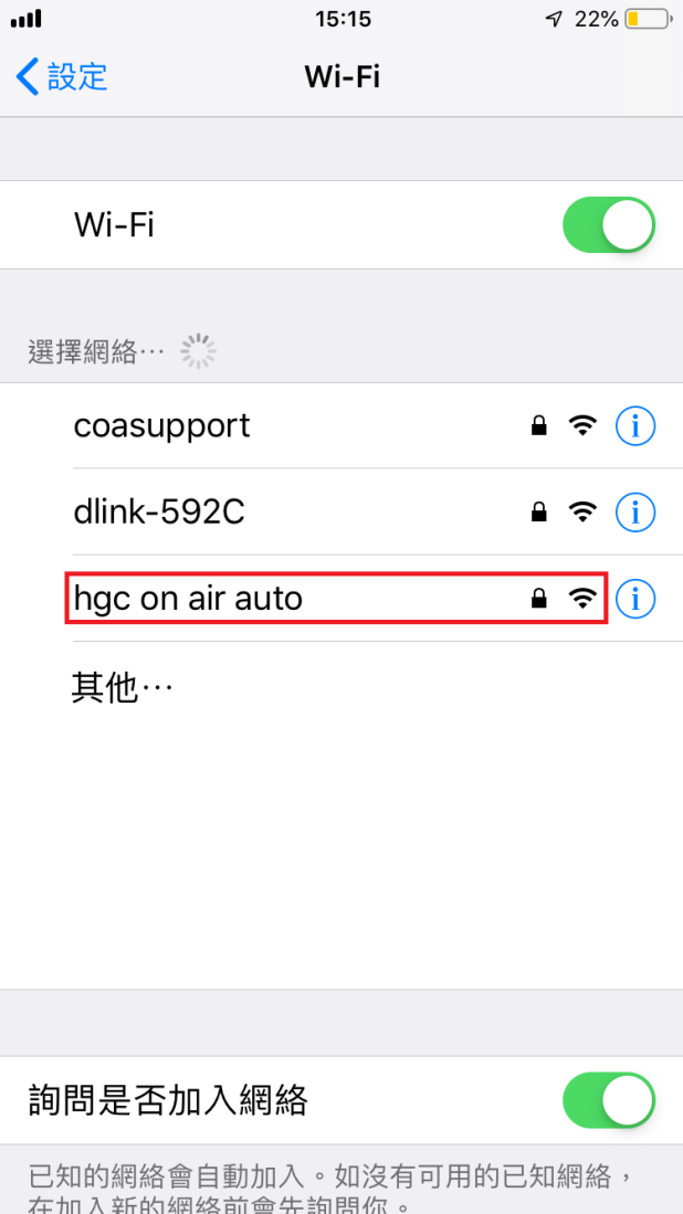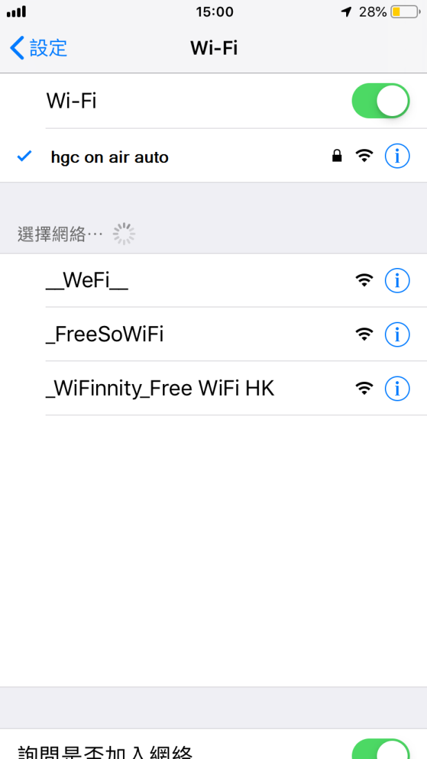 *注意: 如客戶曾使用"hgc on air"服務,在連上"hgc on air auto"Wi-Fi 服務前可於設定忘記"hgc on air"Wi-Fi紀錄以便連接。