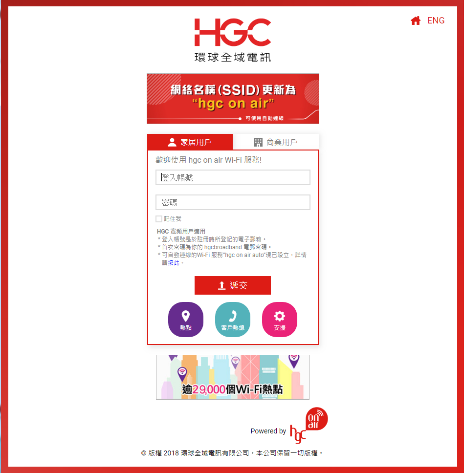 - 作出首次登入後,只要您的裝置在hgc on air auto的熱點覆蓋範圍內,裝置即可自動連接,而無需連接登錄頁面。 重要說明: - 如果您的hgc on air 用量已用完,您的裝置將只會彈出錯誤訊息,如“密碼不正確”。 - 當您的裝置處於hgc on air 熱點範圍內,您的使用分鐘將開始被計算在內。 |