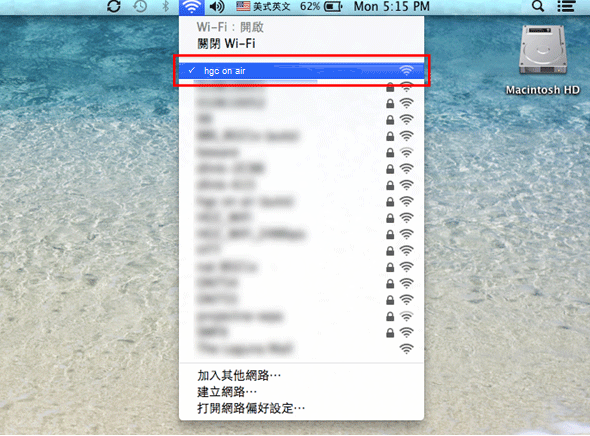 2. 選擇網路名稱 (SSID) 為“hgc on air” 。