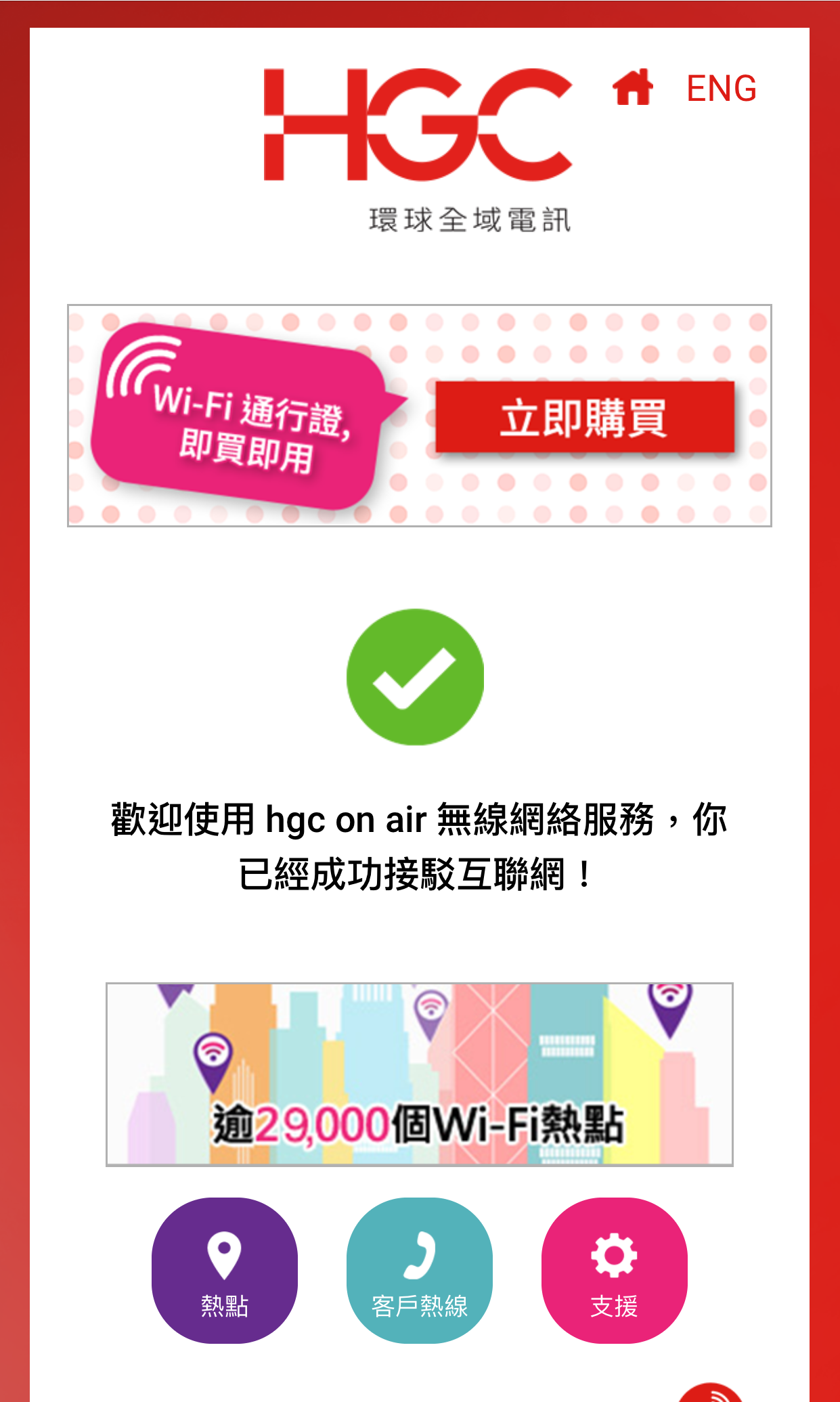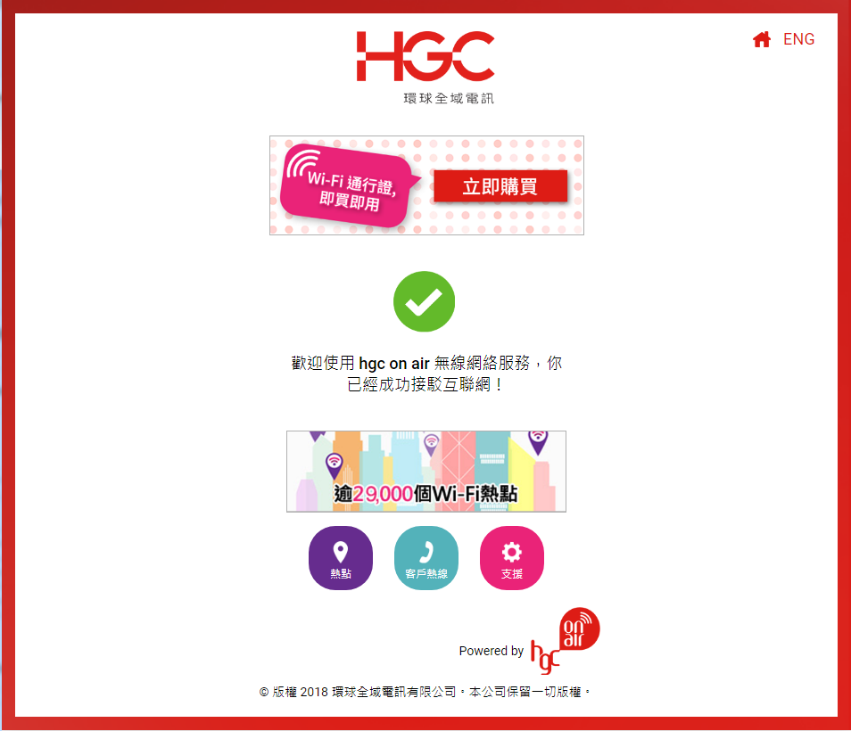 3. 您已成功登入 hgc on air ,立即體驗Wi-Fi上網的樂趣!