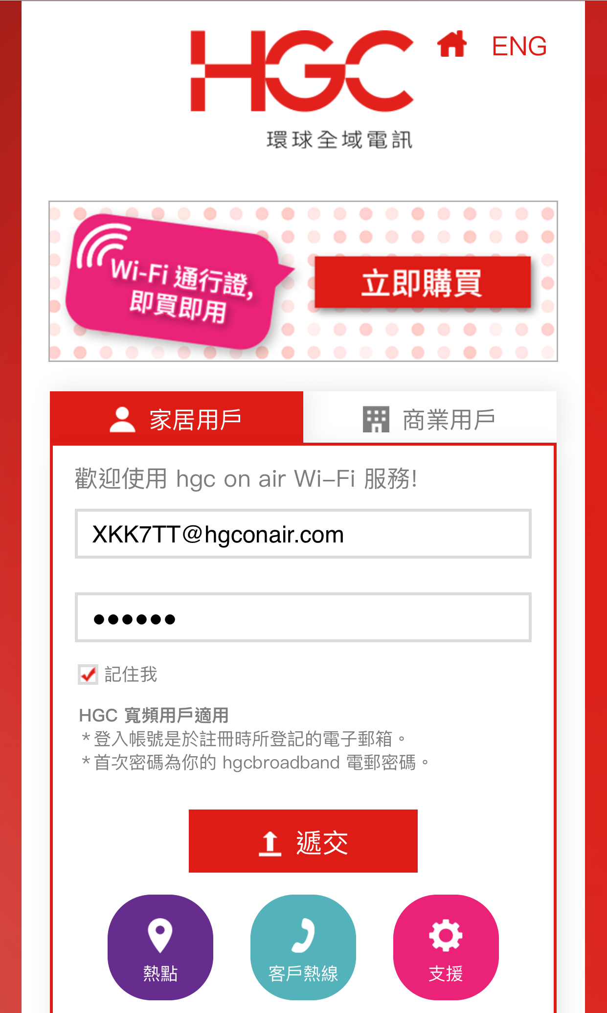 - 您必須打開瀏覽器到hgc on air登錄頁面進行登錄。 - 您可以點擊“記住我”框以保存您的登錄ID和密碼,方便您日後使用。 |